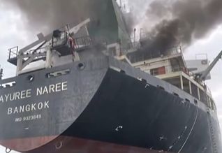 Bretski herurin sigur, at eldur er í bingjuskipi, eftir at tað varð rakt í Hormuzsundinum