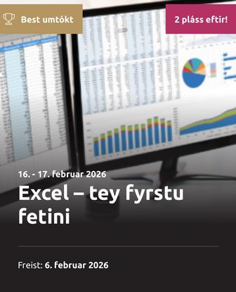 Hevur tú brúk fyri Excel, men ert tú bangin fyri, at tað er ov torført? Kom á okkara 2-daga grundskeið, har tú lærir alt tað grundleggjandi – skjótt og einfalt!