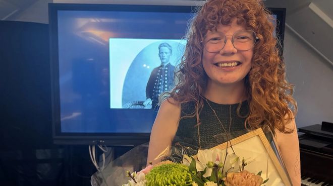 Stóra smílið boðar frá, at hetta er ein góð løta fyri Nansý Sunadóttir, sum saman við nærmastu familjuni er komin á Loftsstovuna á Føroyamálsdeildini á Fróðskaparsetrinum til hátíðarhald á føðingardegi Thorvald Poulsen av Steinum, sum testamenteraði ungum og gávuríkum listafólkum árligt gávugóðs.
