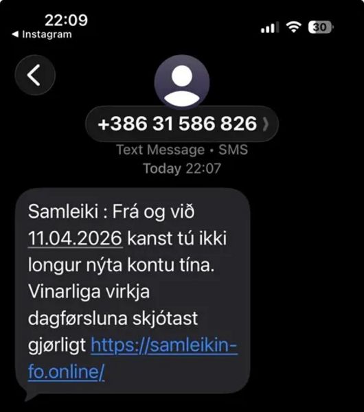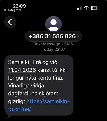 Talgildu Føroyar: Í løtuni herja víðfevnandi svikálop í Føroyum, sonevnd smishing, har tú móttekur SMS-boð, ið síggja út til at koma frá veruligum avsendarum. Í nøkrum førum sær tað út sum at boðini eru frá Samleikanum. Boðini innihalda eitt leinki, og tú verður biðin um at trýsta á tað fyri at dagføra Samleikan.