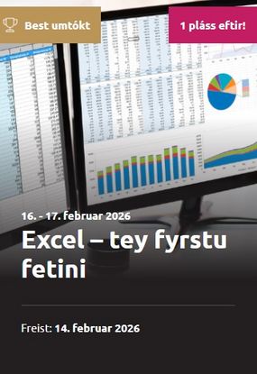 Hevur tú brúk fyri Excel, men ert tú bangin fyri, at tað er ov torført? Kom á okkara 2-daga grundskeið, har tú lærir alt tað grundleggjandi – skjótt og einfalt!