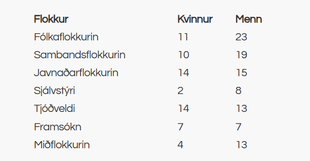 Á listanum hjá Javnaðarflokkinum eru 14 kvinnur av 29 valevnum. Hjá Tjóðveldi eru 14 kvinnur av 27 valevnum. Hjá Framsókn eru 7 kvinnur av 14 valevnum. Á hinum listunum er ójavnstøða. Hjá Sambandsflokkinum eru 10 kvinnur av 29 valevnum. Hjá Fólkaflokkinum eru 11 kvinnur av 34 valevnum. Hjá Sjálvstýri eru 2 kvinnur av 10 valevnum. Og hjá Miðflokkinum eru 4 kvinnur av 17 valevnum.
