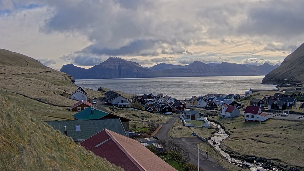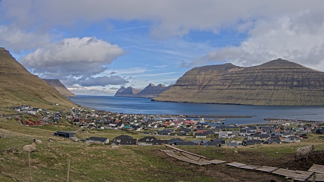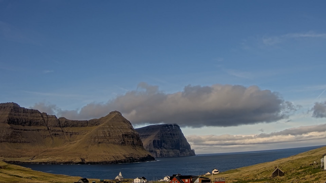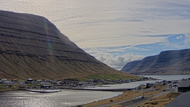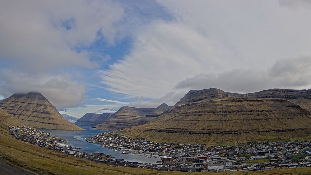 Veðurstovan skrivar um veðrið í dag: Frískt lot til frískan vind av útsynningi, 5 til 10 m/s. Skýggjað, í støðum mjørki, tám ella driv, men eisini sól ella sólglottar, serliga norðanfyri. Hitin 8 til 12 stig.
