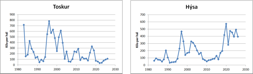 Nøgdin av toski var eitt vet størri enn í fjør, men framvegis lítil í mun til onnur ár og toskurin var rættiliga rak. Nøgdin av hýsu var framvegis stór og var hetta mest smá hýsa. Hýsan var eisini rak í mun til onnur ár. Lítið var at fáa av longu, men nakað tað sama av upsa og gulllaksi. Eins og seinastu tvey árini vóru kalvaspraggur at fáa. Lítið var at síggja av nebbasild í toskamagum.