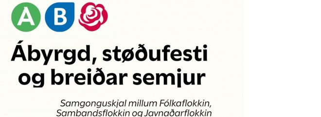 Aðalmálið hjá samgonguni er at taka ábyrgd. Tað gera vit, Fólkaflokkurin, Sambandsflokkurin og Javnaðarflokkurin, við at finna felags loysnir og breiðar og varandi semjur.