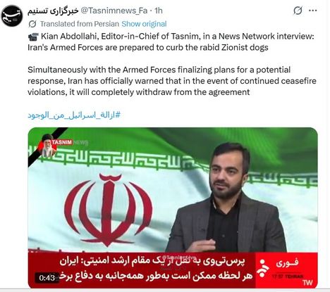 Iranska tíðindastovan Tasnim, sum vísir til eina ónevnda keldu, skrivar, at Iran tekur seg úr vápnahvíldaravtaluni, um álopini á Libanon halda fram.