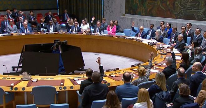 Í ST-trygdarráðnum hava Kina og Russland steðga samtykt um verju av sivilu skipaferðsluni í Hormuzsundinum við at nýta sýtingarrættin.