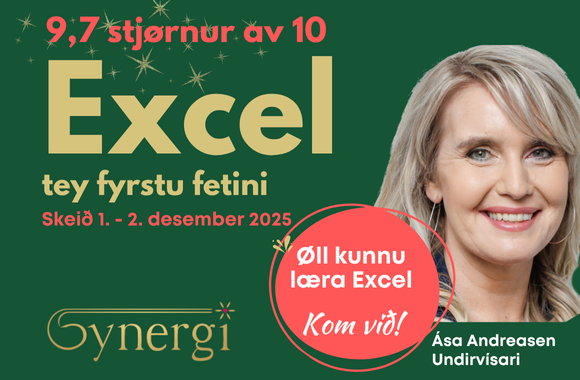 Hevur tú brúk fyri Excel, men ert tú bangin fyri, at tað er ov torført? Kom á okkara 2-daga grundskeið, har tú lærir alt tað grundleggjandi – skjótt og einfalt!