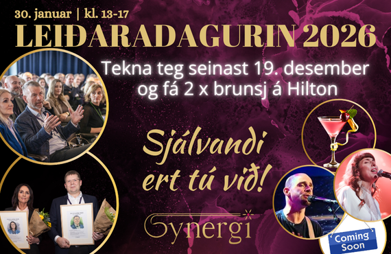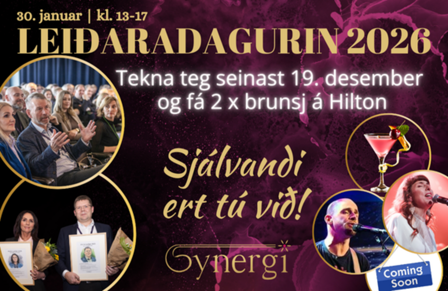 Synergi: Vælkomin til Leiðaradagin 2026 og stílfullu kokteyveitsluna beint aftaná, har vit fagna Ársins Leiðarar og Herðaklappið
