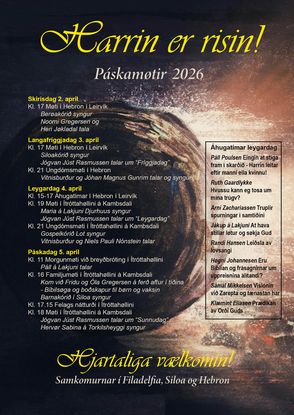 Samkomurnar í Filadelfia, Siloa og Hebron hátíðarhalda uppreisn Harrans Jesusar og bjóða øllum at vera hjartaliga vælkomin á páskastevnu í Hebron í Leirvík og í Ítróttahøllini á Kambsdali.