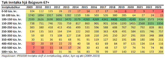 Men veruleikin er meiri fjølbroyttur enn so. Eg havi lagt eina mynd av inntøkubýtinum hjá føroyingum í pensjónsaldri (67+) við. Talan er um tøka inntøku, tvs. inntøkur eftir skatt og gjøld.