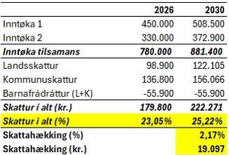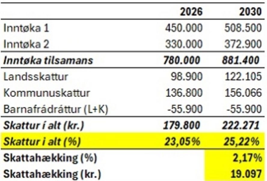 Also: um hækkingin í inntøkuni verður óbroytt, og skattasatsir ikki verða hækkaðir samsvarandi, so fer skattatrýstið hjá hesari familjuni at hækka 2,17 %-stig svarandi til 19.097 kr. í 2030.
