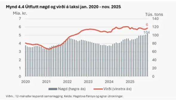 Eisini fyri 2026 væntast ein vøksur í alvinnuni bæði í prísi og nøgd, tí væntast at eisini í 2026 fer útflutningsvirðið av laksi at økjast.