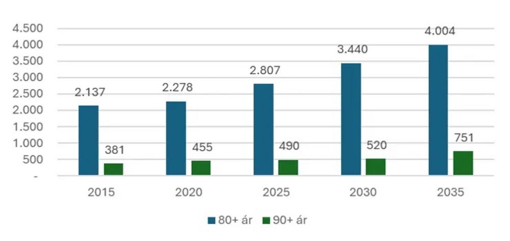 Talið av 80+ ára gomlum byrjar at vaksa munandi komandi árini, sí myndina niðanfyri. Orsøkin er øktur livialdur, og harafturat at fleiri stórir árgangir gerast 80+ ára gomul. Talið av 80+ ára gomlum fer at vaksa úr 2.800 fólkum í 2025 til 4.000 fólk í 2035, ein vøkstur á sløk 45%.