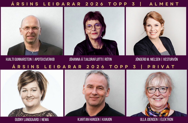 Synergi: Dómsnevndin at velja Ársins leiðarar og Herðaklappið til millumleiðaran hevur nú valt Topp 3 Ársins Leiðarar 2026 – bæði innan almenna og privata geiran. Í dómsnevndini sita Árni Jakobsen, nevndarformaður SMJ, Alexandra á Dul, stjóri í sjúkrahúsverkinum og á Klaksvíkar sjúkrahúsið og Anja Rein, nevndarlimur í fleiri nevndum.