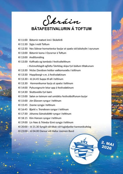 Bátatilmelding til ársins fyrsta bátafestival, ið verður á Toftum leygardagin 2. mai.