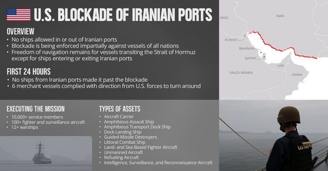 More than 10,000 U.S. Sailors, Marines, and Airmen along with over a dozen warships and dozens of aircraft are executing the mission to blockade ships entering and departing Iranian ports. During the first 24 hours, no ships made it past the U.S. blockade and 6 merchant vessels… pic.twitter.com/dpWAAknzQp